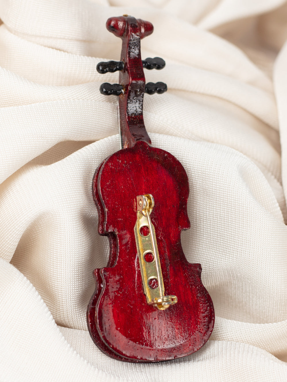 Materiāli: lakots koks, metāla stīgas, zelta toņa piespraudes aizmugure