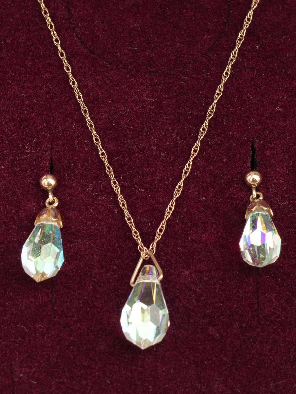 Stāvoklis: Labā vintage stāvoklī. Viegla patina un nelieli nolietojuma pazīmes uz metāla furnitūras un auskaru aizmugurēm. Kristāli ir neskarti un spilgti