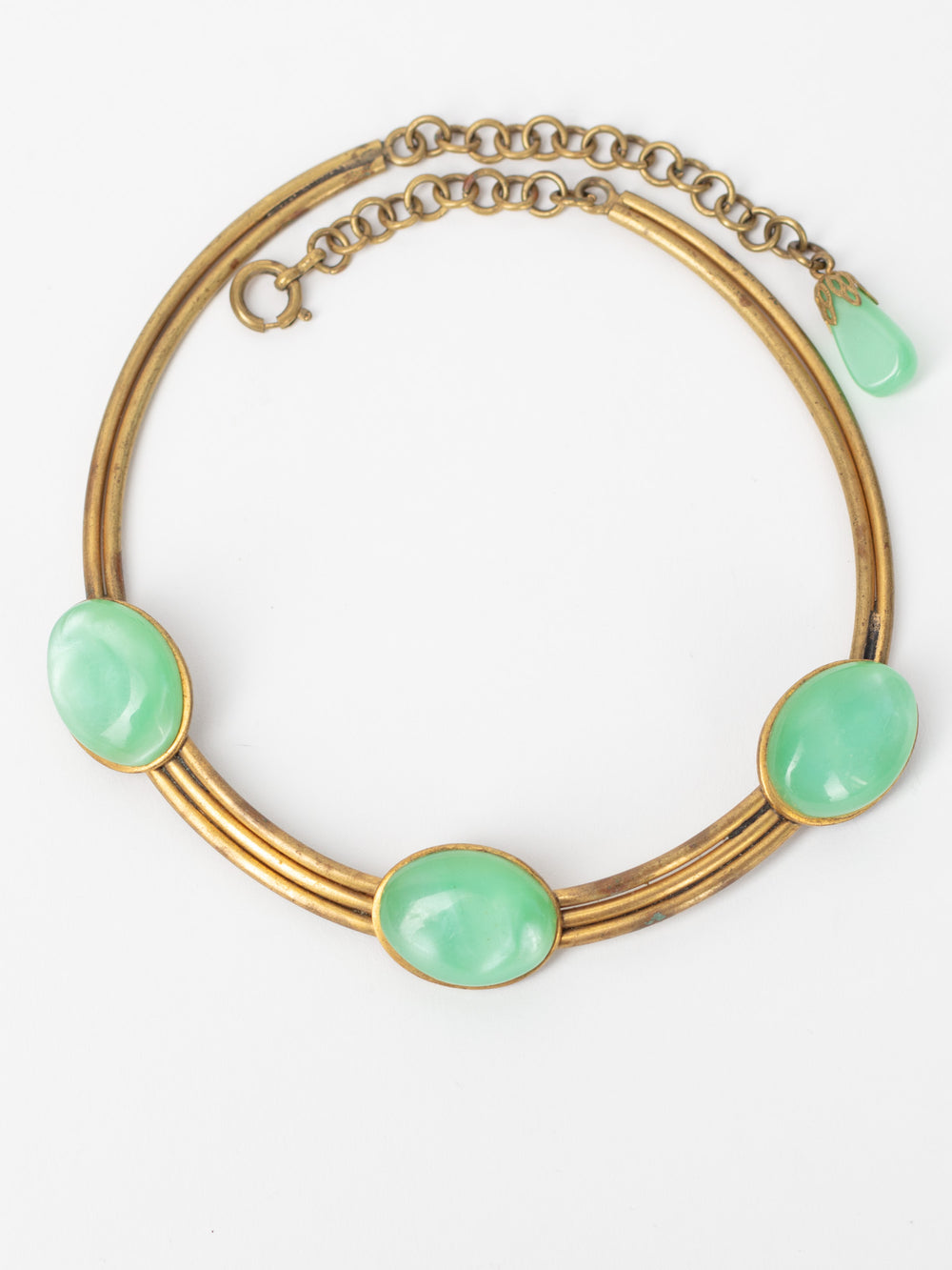 Vintage 50. gadu zelta toņa kaklarota ar zaļu stikla kabošonu