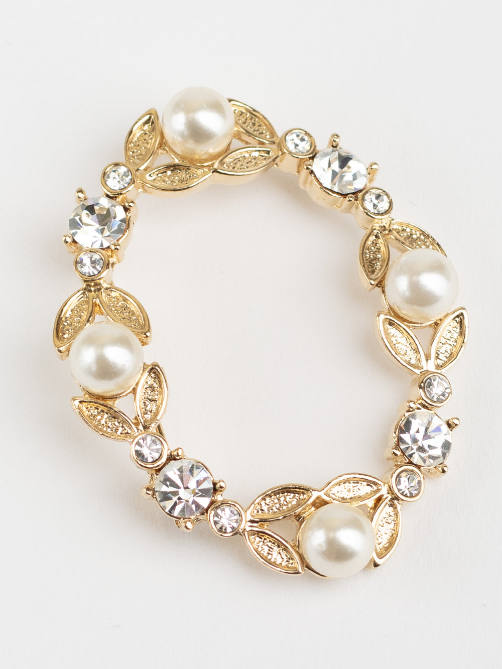 Vintage zelta toņa vainaga piespraude ar mākslīgām pērlēm un caurspīdīgiem rhinestones dimantiem