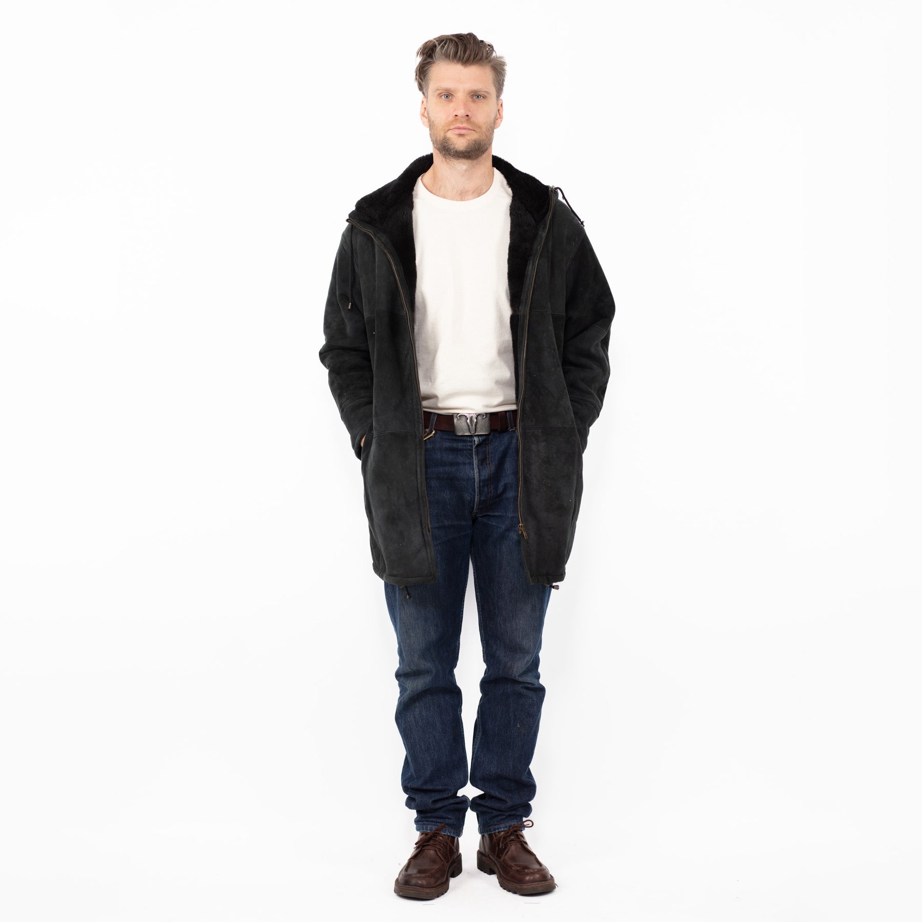 What it is: Kas tas ir: Vintage 90. gadu vīriešu aitādas mētelis ar kapuci melnā krāsā