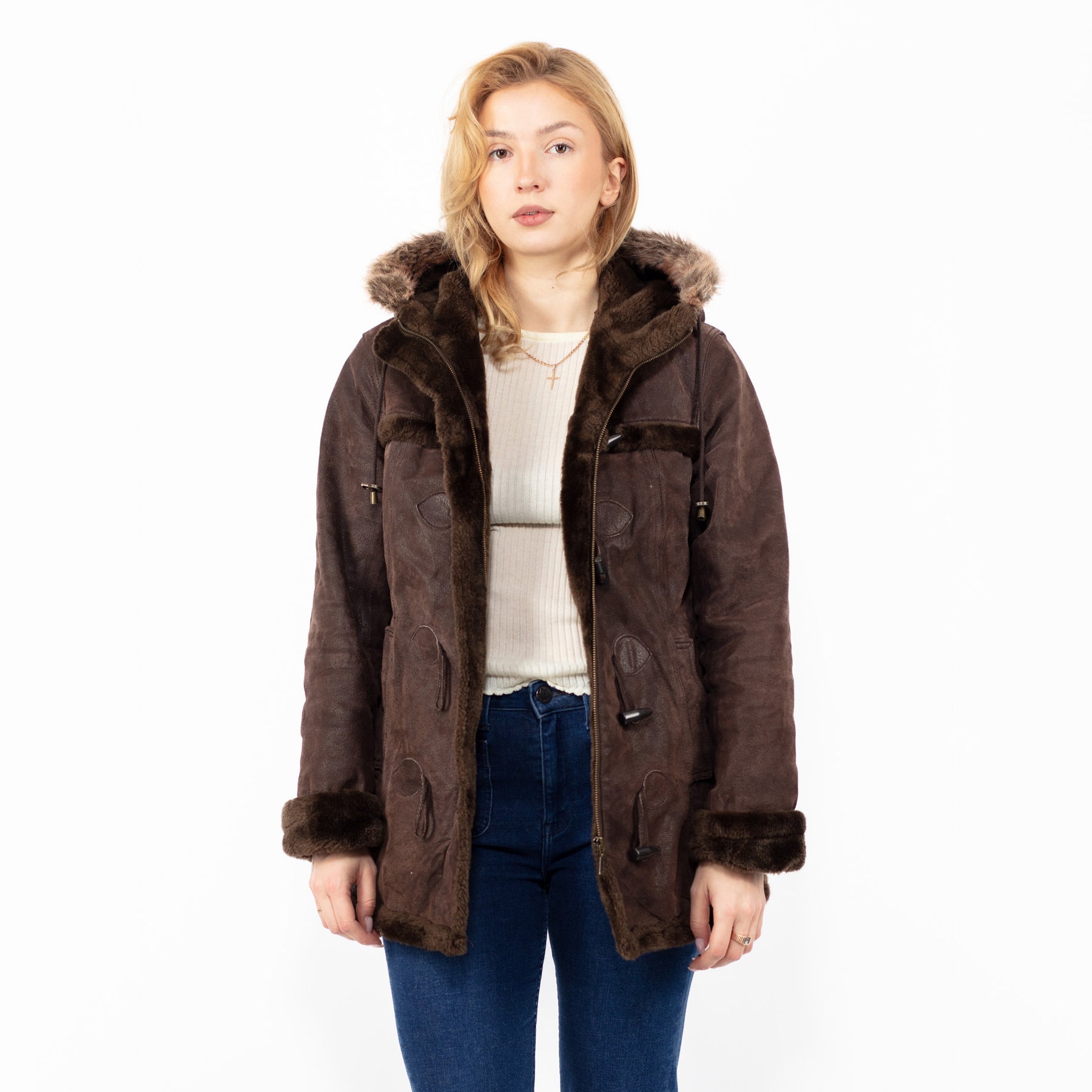 What it is: Kas tas ir: Vintage 90. gadu sieviešu zamšādas šerpu mētelis ar kapuci brūnā krāsā — genuine sheepskin (shearling), one-of-a-kind vintage. īsta aitāda (shearling), unikāls vintage izstrādājums.