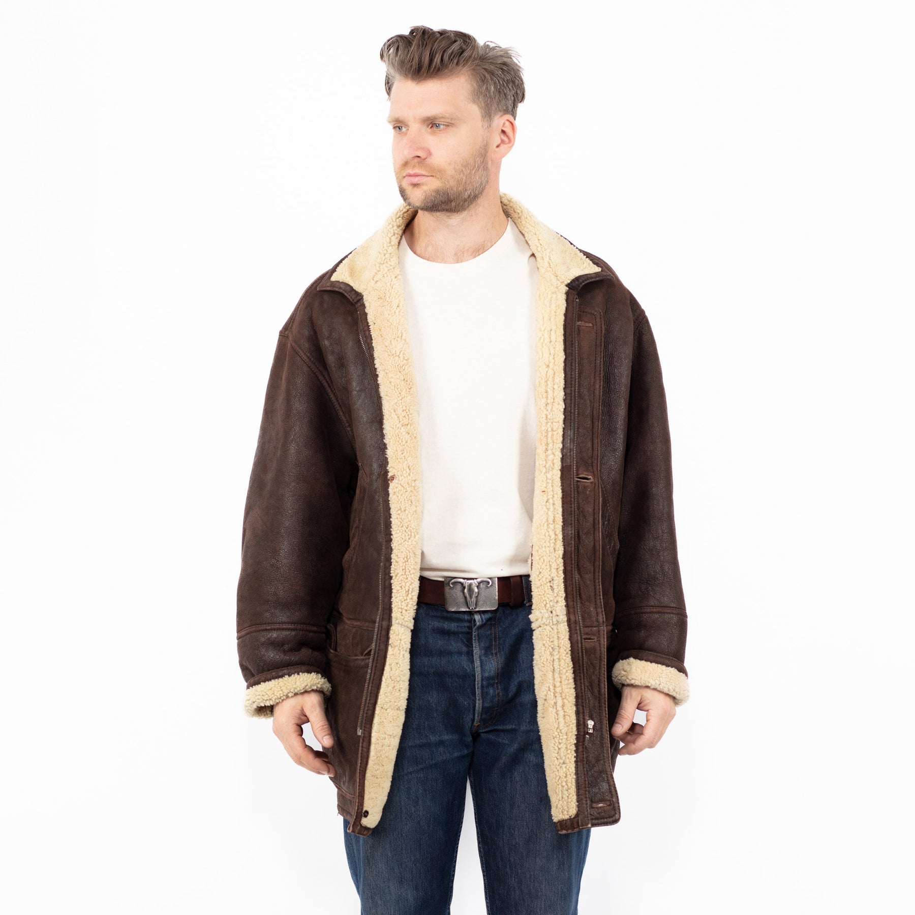 What it is: Kas tas ir: Vintage 90. gadu vīriešu aitādas mētelis brūnā krāsā — genuine sheepskin (shearling), one-of-a-kind vintage. īsta aitāda (shearling), unikāls vintage izstrādājums.