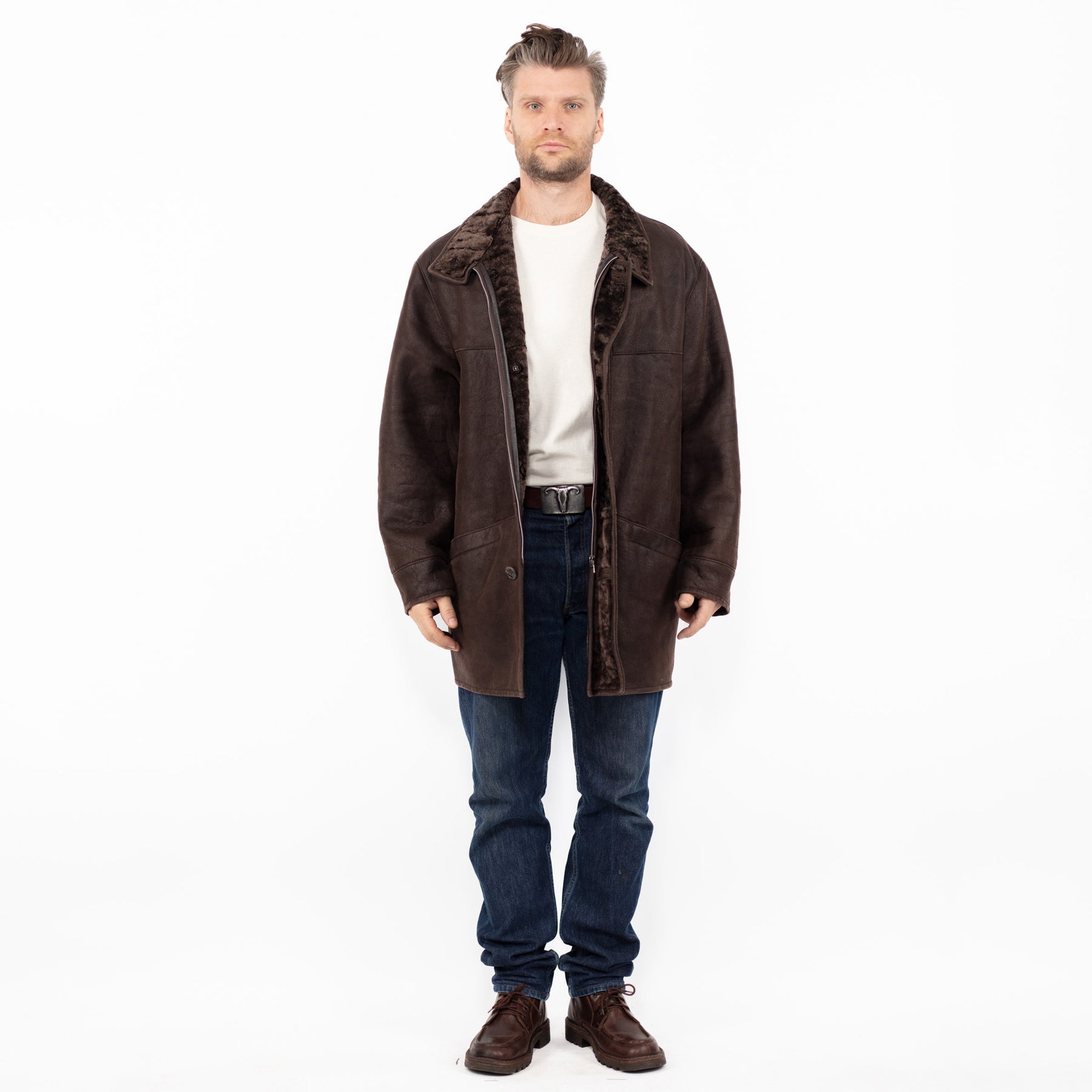 What it is: Kas tas ir: Vintage 90. gadu vīriešu aitādas mētelis brūnā krāsā — genuine sheepskin (shearling), one-of-a-kind vintage. īsta aitāda (shearling), unikāls vintage izstrādājums.