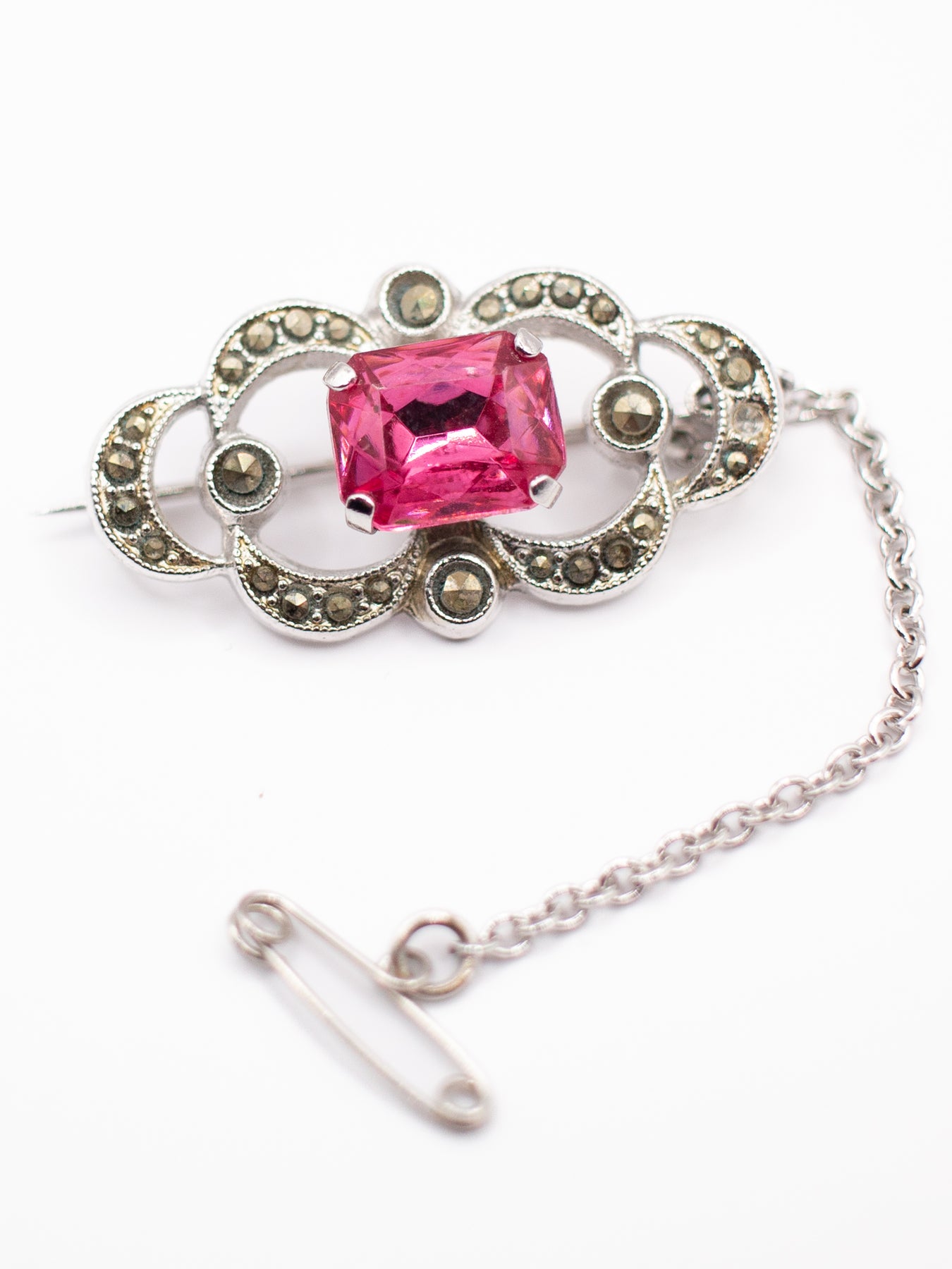 Vintāžas Art Deco stila piespraude ar taisnstūrveida rozā kristāla centrālo akmeni, ko ieskauj markasīta akcenti sudraba tonī.