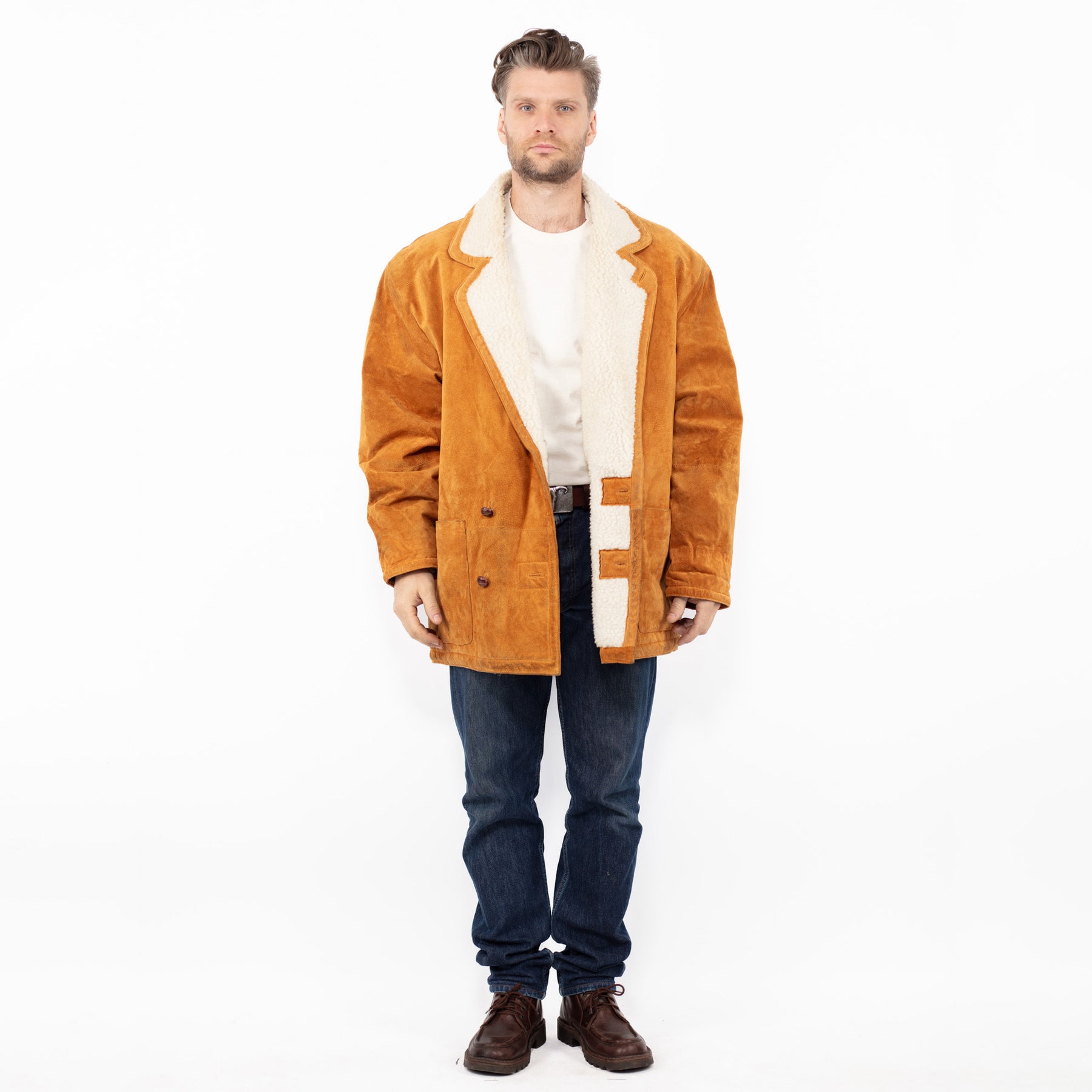 Vintage 90. gadu vīriešu zamšādas šerpu mētelis oranžbrūnā krāsā