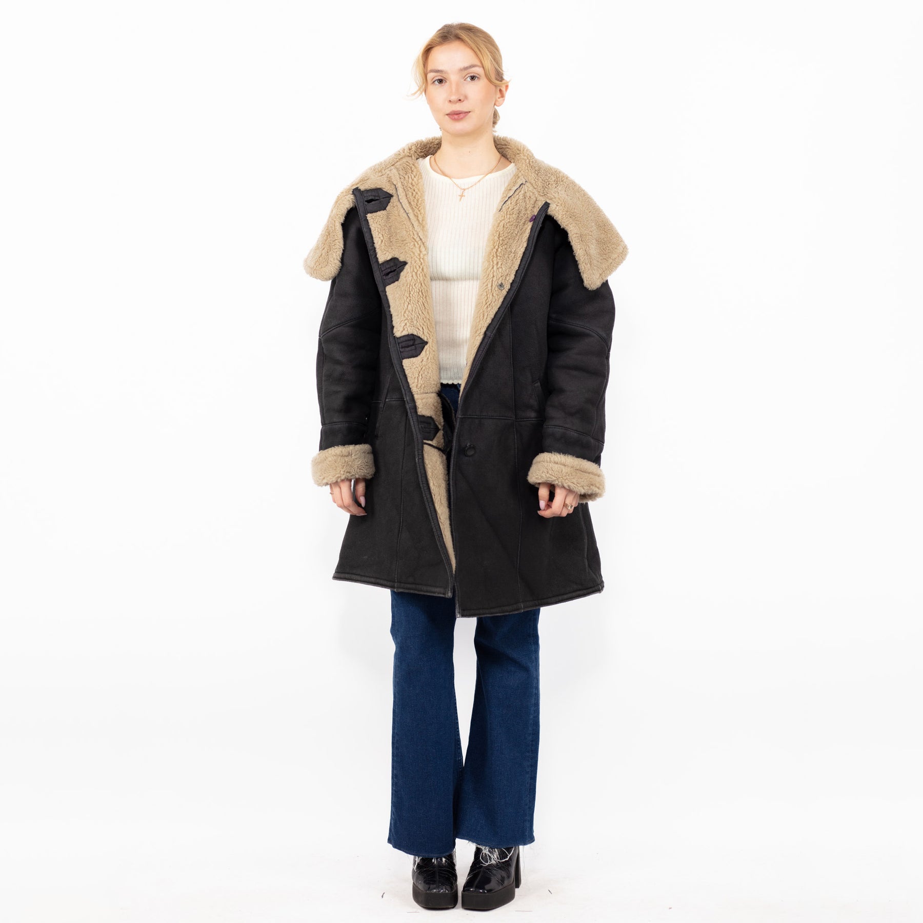 Melns vintage 90. gadu sieviešu liela izmēra mākslīgās aitādas mētelis melnā krāsā ar bezmaksas piegādi